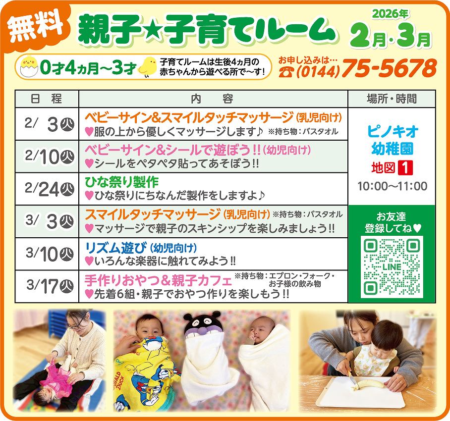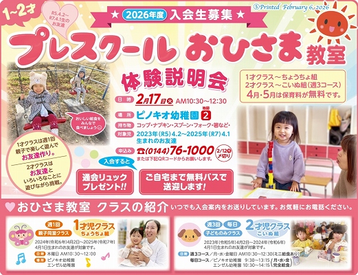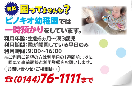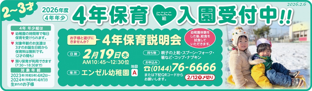 ■ 連絡 事項 ■ たのしいね〜♪ ![]() ![]() ・ 小さい字の画面を ポン とタップすると 画面が大きくなります。 ![]() 0144 76 1000 ![]() 0144 76 6666 ![]() ![]() 0144 76 1111 0144 75 5678 ![]() ・ プログラムの画面を ポン とタップすると 画面が大きくなります。 ![]() ![]() ![]() ![]() ![]() ![]() ![]() ハロウィンパーティー♪ 秋のコンサート! ![]() ![]() みんな元気! いっぱい楽しもうね♪ ![]() ![]() ![]() ![]() おともだち、ご家族様、 皆々様の益々のハッピーをお祈りしてます。 <br> お誕生日おめでとう! 益々のお幸せをお祈りしてます♪ お友達と楽しいね♪ ![]() 保育園、うんどう会!2025.09.20 0才児〜2才のお友だちですよ。 みんな、可愛い〜 なかよし牧場! 思い出になりますように♪ 2025.09.11 ![]() ![]() ![]() ![]() ![]() 0才〜のお友だち〜♪ ![]() ![]() ![]() ![]() ![]() ![]() ![]() ![]() ![]() ![]() ![]() ![]() ![]() ![]() ![]() ![]() ![]() ![]() ![]() ![]() ![]() ![]() ![]() お手伝い、ありがとうございました! お陰様で園児がスケートをたくさん 楽しめました。 心から感謝しております。 ![]() ![]() 保育園・幼稚園の先生 募集! 2時間から 働けます! 教育環境の向上のため、先生を募集してます。 子どもと過ごすのが 大好きな方を募集しております。 ご希望の方、お知り合いの方が いらっしゃいましたら ご応募、よろしくお願いいたします。 m(__)m 保育日の朝、地震発生の対応について もし,保育日の朝、登園前に 震度5以上の地震が発生した時は休園とします。 この時は、連絡できません。 幼稚園再開は、安全確認が終わり 通信環境が整い次第 ホームページ・メール・連絡網等で ご連絡いたします。 連絡があるまでは ご自宅で 待機 願います。 すでに、通園バスに乗車した園児につきましては、 幼稚園にて保護します。 以上、ご協力 よろしく お願いいたします。 0才〜の 親子レクリエーション教室 月2回無料!! みんなで ワイワイ 楽しく あそびましょう〜♪ お問い合わせは、TEL 0144-75-5678 ベビーエンゼル!! 生後、4ヵ月より お預かり!! 生後 4ヵ月〜の 赤ちゃんを おあずかりいたしてま〜す お問い合わせは、T. 0144-75-7373 または、メール bz007947@bz01.plala.or.jp まで♪ 持ちものに お名前を! お手数でも、すべてのものに お名前や しるしを付けてください。 よろしく〜♪ 運動 あそび! 「運動 大好き!」 って 園児から声がかかることを 願っております。 身体を動かすって 楽しい〜、おもしろ〜い を 実感してもらおうと思います。 うまい、へた ではなく、 好きになって もらいたいで〜す♪ ♥ このページをスクロールして下さると、子ども達の普段の様子を ご覧いただけます。 ■ ご案内 ■ 満3歳児入園(4年保育)随時受付中 ★ 中途入園も受け付けております。 ★ 0歳児クラスもあります。 天体観測会 場所 : 天文台(スターワールド館) 毎月1回実施。参加自由・無料です。 ![]() ![]() ![]()