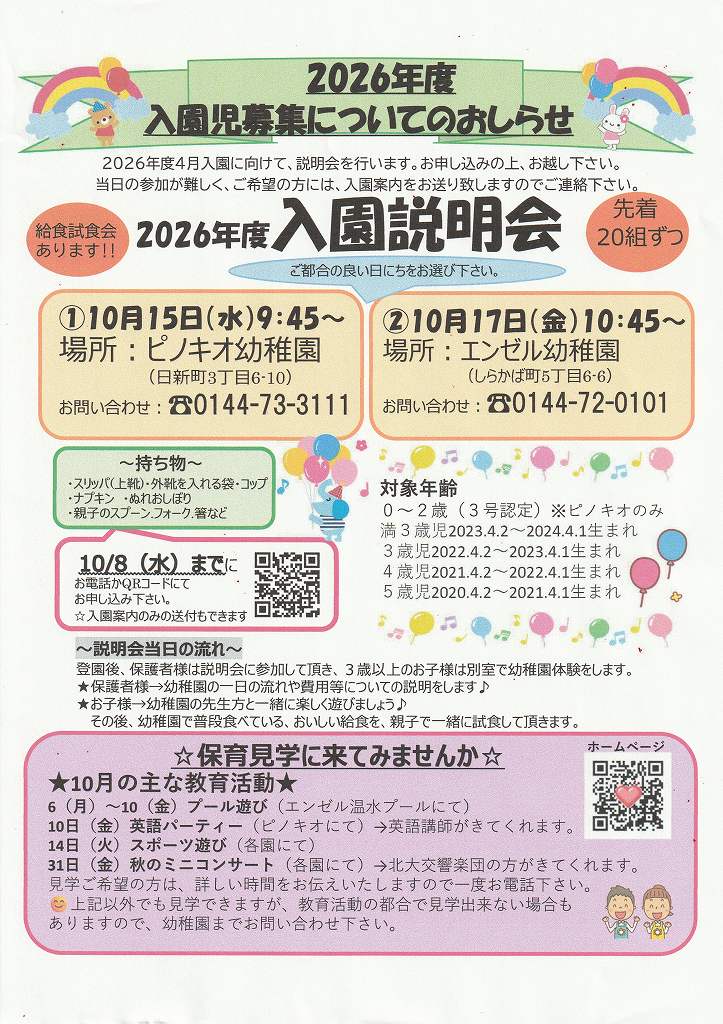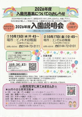 ■ 連絡 事項 ■ ・ 画面を ポン!と タップすると、大きく見えますよ。 ![]() 保育園、うんどう会!2025.09.20 0才児〜2才のお友だちですよ。 みんな、可愛い〜 なかよし牧場! 思い出になりますように♪ 2025.09.11 ![]() ![]() ![]() ![]() ![]() 0才〜のお友だち〜♪ ![]() ![]() ![]() ![]() ![]() ![]() ![]() ![]() ![]() ![]() ![]() ![]() ![]() ![]() ![]() ![]() ![]() ![]() ![]() ![]() ![]() ![]() ![]() ![]() ![]() ![]() ![]() ![]() ![]() ![]() プール開き! さぁ、温かプール遊ぼうね! 楽しいよ! ![]() 元気なお兄さん・お姉さん! 新学期になって、いっそう頼もしくなりました。 体を動かしていっぱい遊ぼうね。 ![]() ベビーさん! 可愛い〜♪ ![]() お誕生日おめでとう! お誕生会で「がったんごっとん」 お兄ちゃん・お姉ちゃんになりましたね♪ ![]() 汽車ポッポ、じょうず! お友だちと一緒、じょうずだね〜♪ ![]() 小さいお友達と! 「がったんごっとん」です♪ みんな、遊びに来てね。 ![]() 新学期がスタート! お友達と元気に楽しく過ごしてますよ♪ ![]() お手伝い、ありがとうございました! お陰様で園児がスケートをたくさん 楽しめました。 心から感謝しております。 ![]() ![]() 保育園・幼稚園の先生 募集! 2時間から 働けます! 教育環境の向上のため、先生を募集してます。 子どもと過ごすのが 大好きな方を募集しております。 ご希望の方、お知り合いの方が いらっしゃいましたら ご応募、よろしくお願いいたします。 m(__)m 保育日の朝、地震発生の対応について もし,保育日の朝、登園前に 震度5以上の地震が発生した時は休園とします。 この時は、連絡できません。 幼稚園再開は、安全確認が終わり 通信環境が整い次第 ホームページ・メール・連絡網等で ご連絡いたします。 連絡があるまでは ご自宅で 待機 願います。 すでに、通園バスに乗車した園児につきましては、 幼稚園にて保護します。 以上、ご協力 よろしく お願いいたします。 0才〜の 親子レクリエーション教室 月2回無料!! みんなで ワイワイ 楽しく あそびましょう〜♪ お問い合わせは、TEL 0144-75-5678 ベビーエンゼル!! 生後、4ヵ月より お預かり!! 生後 4ヵ月〜の 赤ちゃんを おあずかりいたしてま〜す お問い合わせは、T. 0144-75-7373 または、メール bz007947@bz01.plala.or.jp まで♪ 持ちものに お名前を! お手数でも、すべてのものに お名前や しるしを付けてください。 よろしく〜♪ 運動 あそび! 「運動 大好き!」 って 園児から声がかかることを 願っております。 身体を動かすって 楽しい〜、おもしろ〜い を 実感してもらおうと思います。 うまい、へた ではなく、 好きになって もらいたいで〜す♪ ♥ このページをスクロールして下さると、子ども達の普段の様子を ご覧いただけます。 ■ ご案内 ■ 満3歳児入園(4年保育)随時受付中 ★ 中途入園も受け付けております。 ★ 0歳児クラスもあります。 天体観測会 場所 : 天文台(スターワールド館) 毎月1回実施。参加自由・無料です。 ![]() ![]() ![]()
